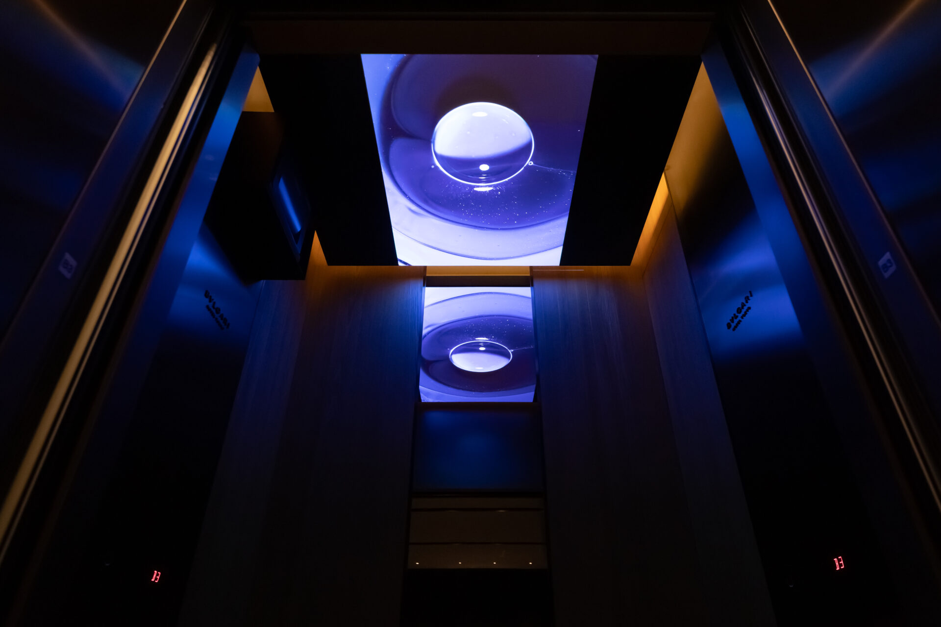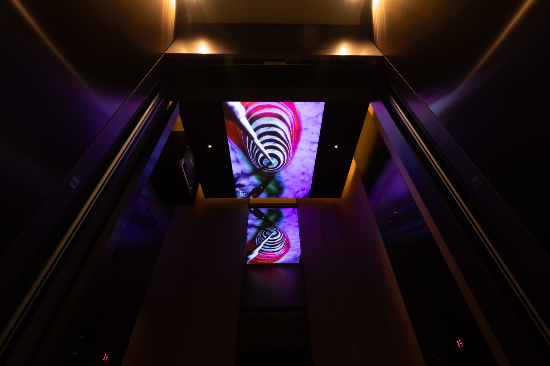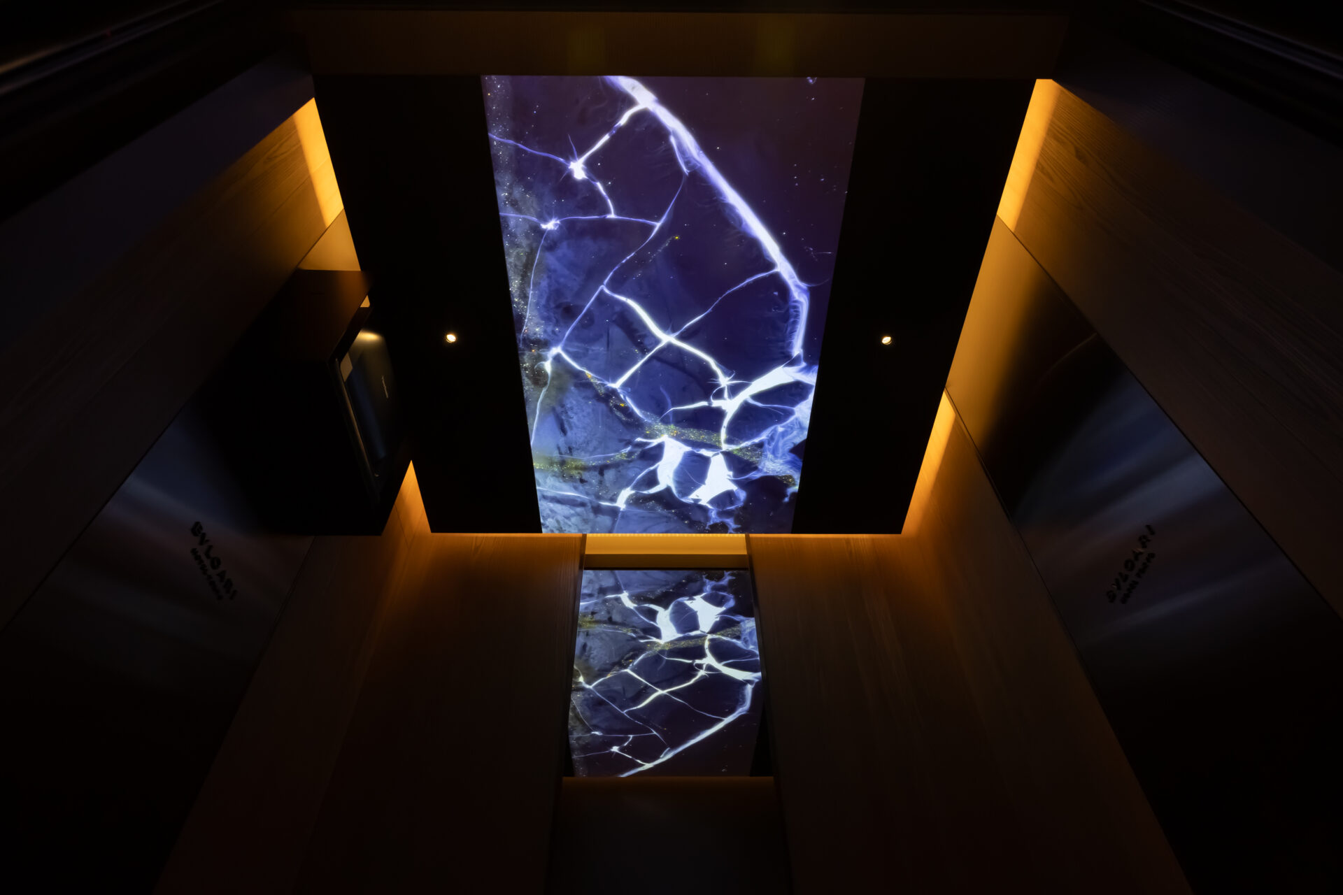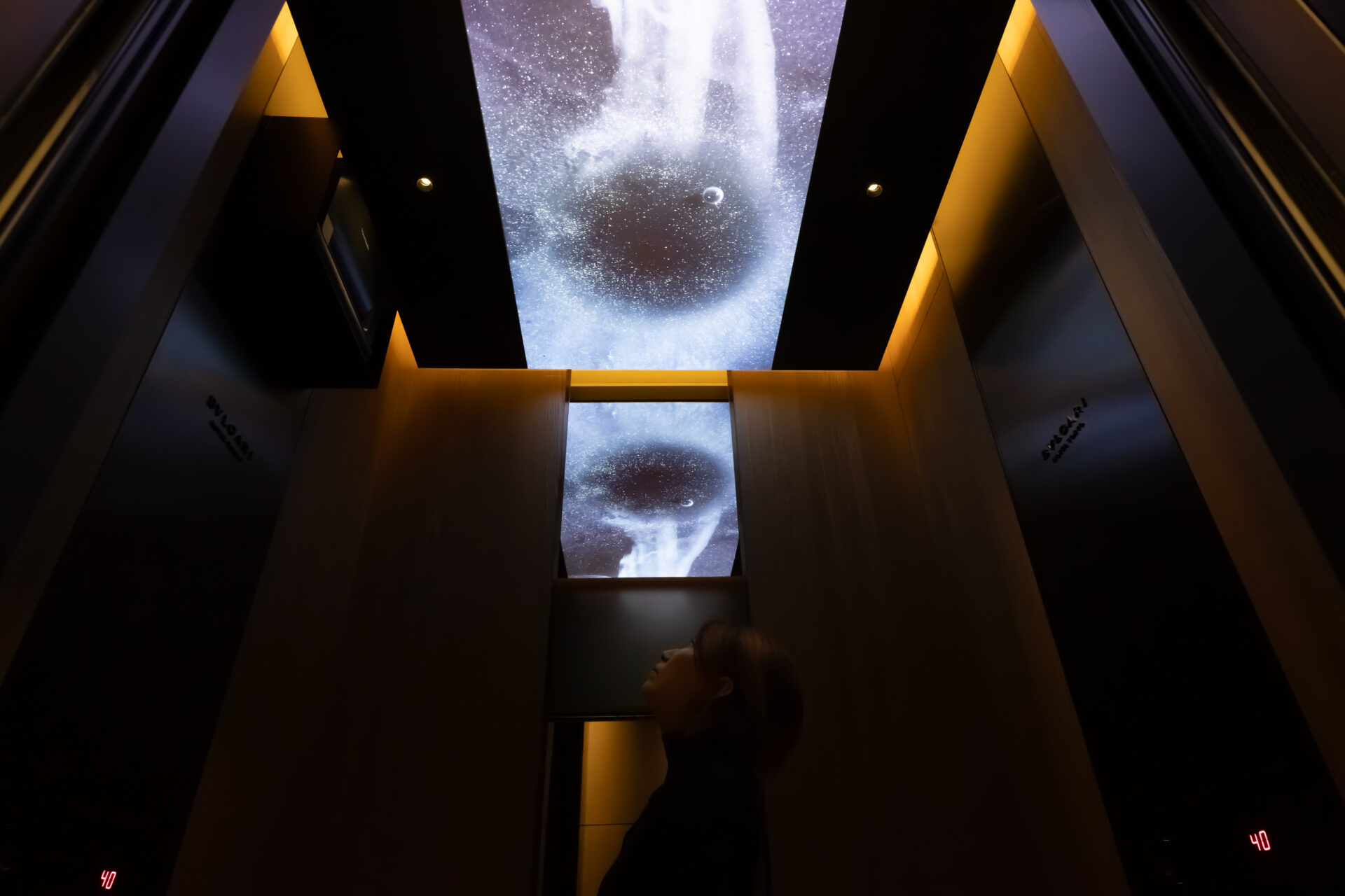 「Breaking the Night Sky」夜空を割って差し込む陽光を描いたダイナミックな天井画、の4つの異なる映像作品を4基のエレベーターで上映します。