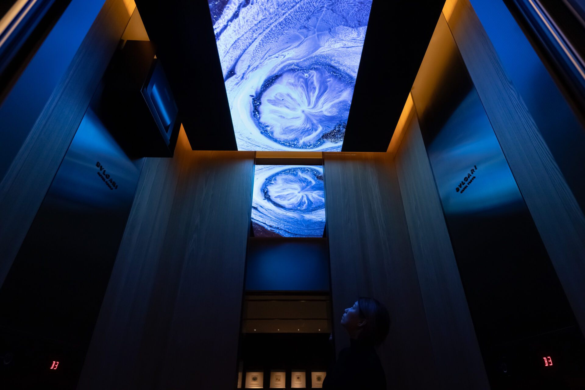 現在、国立新美術館で開催中の「ブルガリ カレイドス 色彩・文化・技巧」展の開催に伴い、アーティスト中山晃子による新たなインスタレーションがBVLGARI HOTEL TOKYOのエレベーターに登場しています。万華鏡のように広がる色彩をインスピレーションにした彼女の”Alive painting”は、映像を通じて流れる物語を紡ぎ出します。「Timepiece」絵筆で空に時を描いていくような天井画、