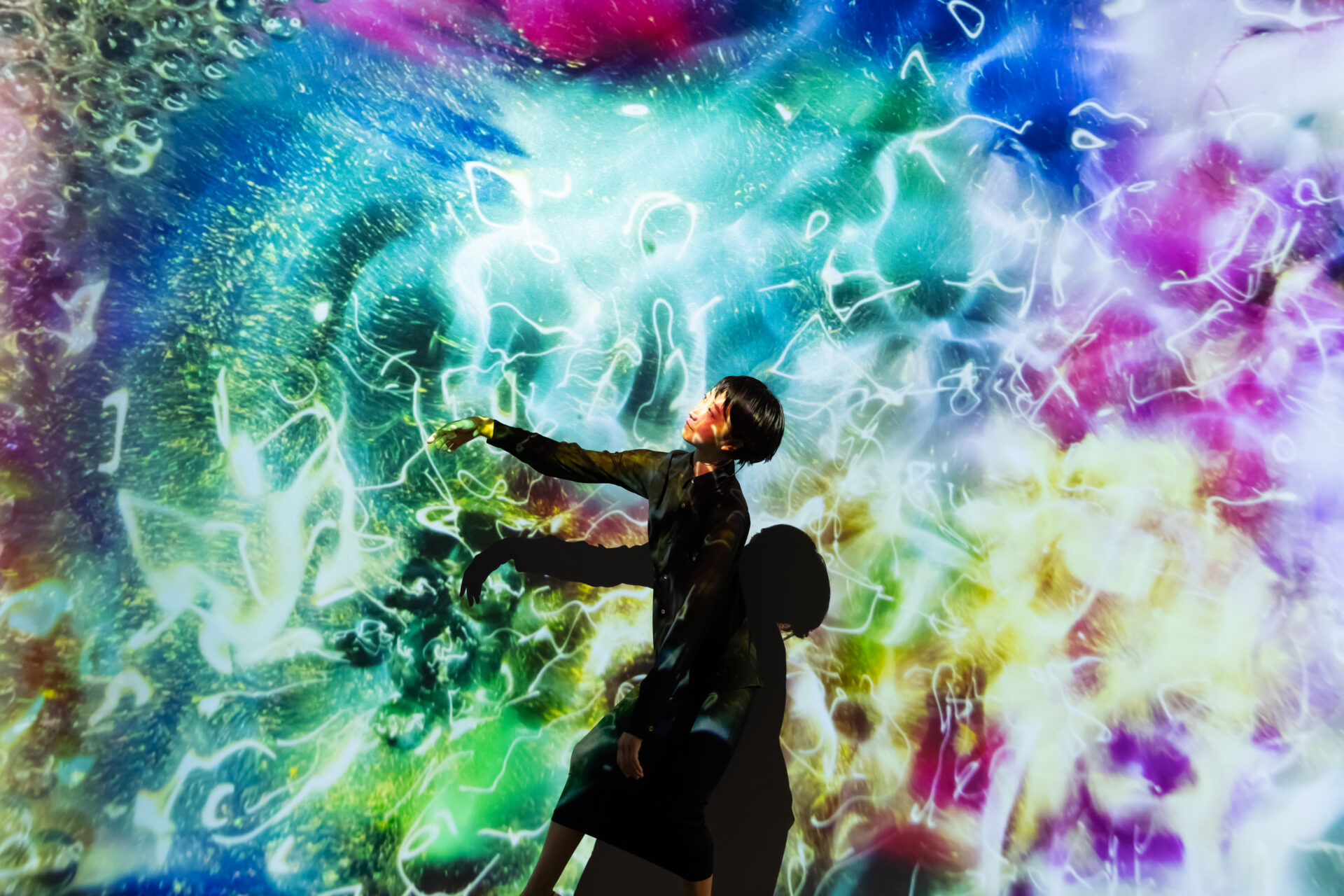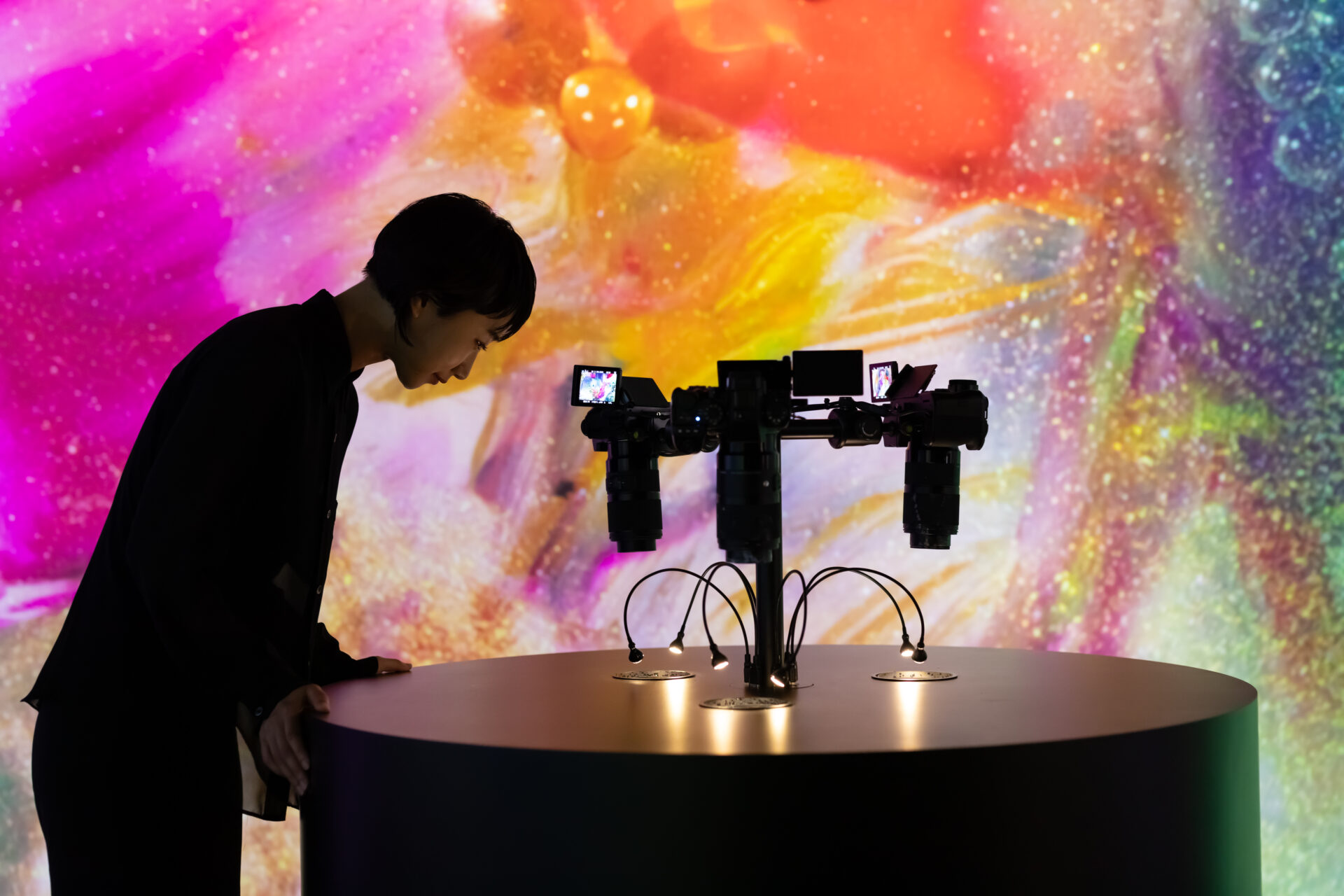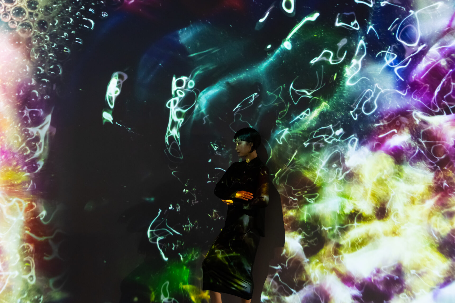 中山晃子によるダイナミックなインスタレーション《Echo》は、水、音、鉱物顔料が混ざり合いながら、移ろいゆく流動的なフォルムを形成するさまを空間全体に投影します。それは、アート、自然、物理学が、変化し続ける光の中で交錯する「Alive Painting」です。ブルガリ・ヘリテージ・コレクションのまばゆい《コンバーチブル・ソートワール=ブレスレット》(1969年頃)と対話を交わしながら、中山の作品は、絶えず変容する色彩の儚い美しさを包み込みます。